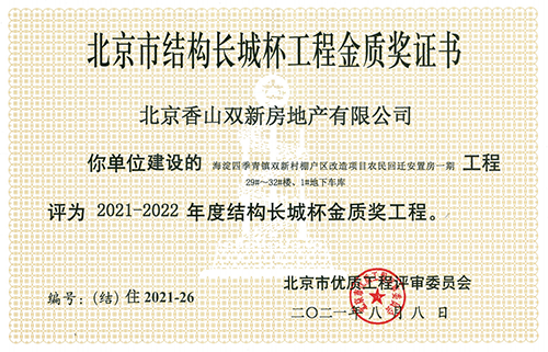 喜訊!由北京香山雙新房地產(chǎn)有限公司建設(shè)的海淀區(qū)四季青鎮(zhèn)雙新村棚戶區(qū)改造項(xiàng)目農(nóng)民回遷安置房一期(29#~32#樓、1#地下車庫(kù))工程,榮獲2021-2022年度北京市建筑結(jié)構(gòu)長(zhǎng)城杯金質(zhì)獎(jiǎng)工程。